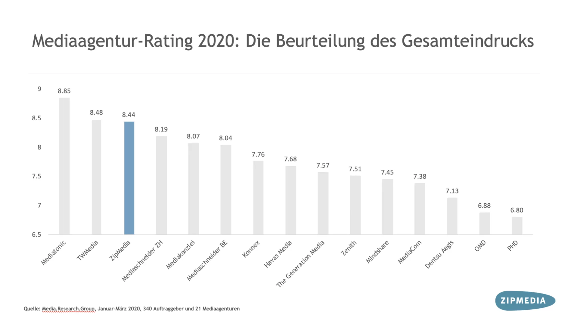 Die Media.Research.Group befragt jährlich die 750 grössten Schweizer Werbeauftraggeber über die Leistungen ihrer Mediaagentur; die Rücklaufquote beträgt rund 50%. Bewertet wurden insgesamt 21 Mediaagenturen in der Schweiz.